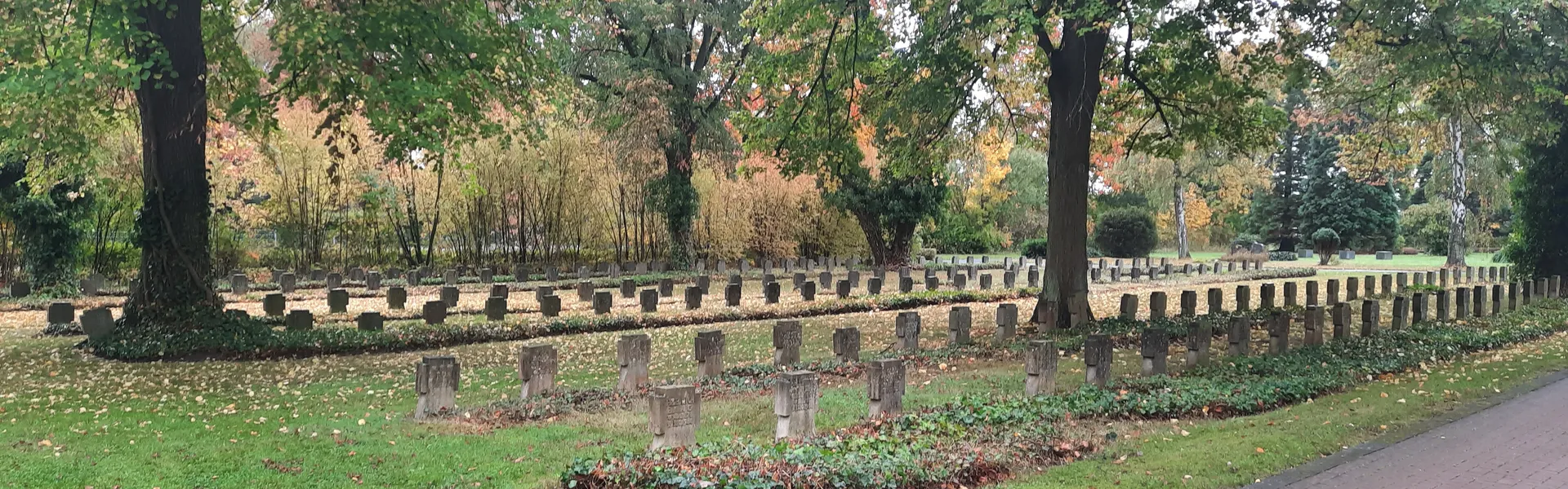 Ein Teil der wahrscheinlich über 1.000 Opfer der Bombennacht am 14./15.10.ˋ44 liegt unter den langen Grabreihen in einem Bereich des Hauptfriedhofes.